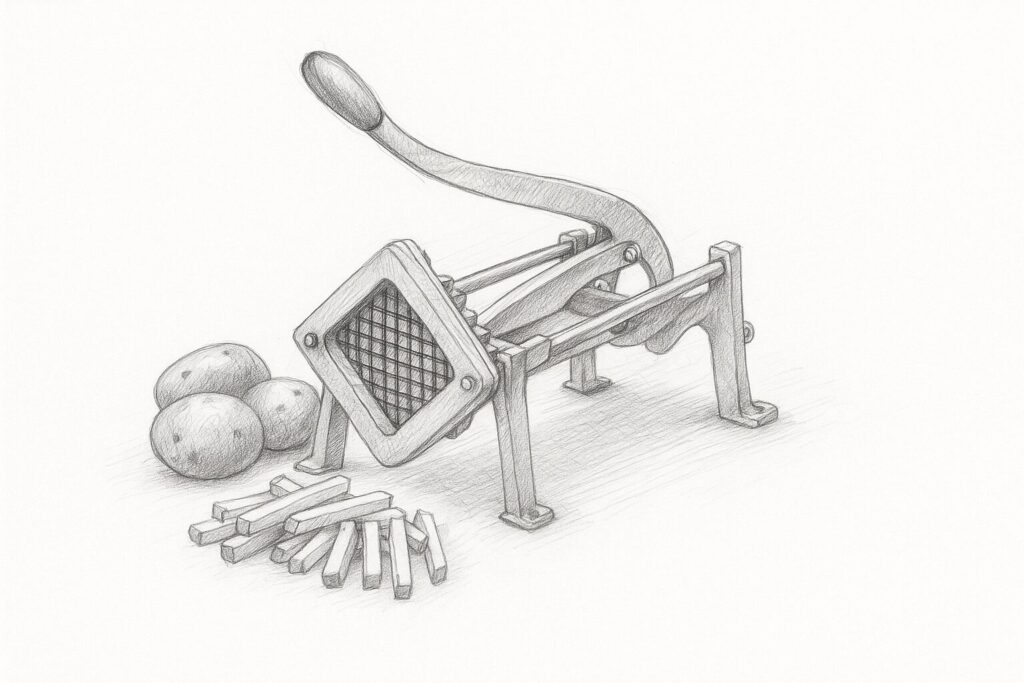 I write code the same way a good potato cutter works: elegant mechanics delivering perfectly shaped results, with minimal waste and maximum consistency.