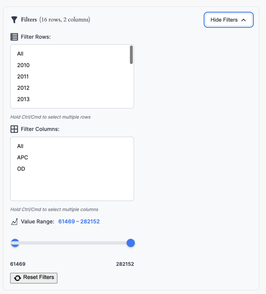 📈 Multiple Chart TypesGo beyond heat maps with bar charts, pie charts, and line graphs.🌐 External Data SourcesConnect to REST APIs and CSV URLs to visualize data from anywhere.🎛️ Interactive Filters (Slicers)Let users filter and explore data dynamically.📥 CSV ExportExport chart data with one click for further analysis.🔗 Chart LinkingCreate dashboards with multiple linked charts that filter each other.